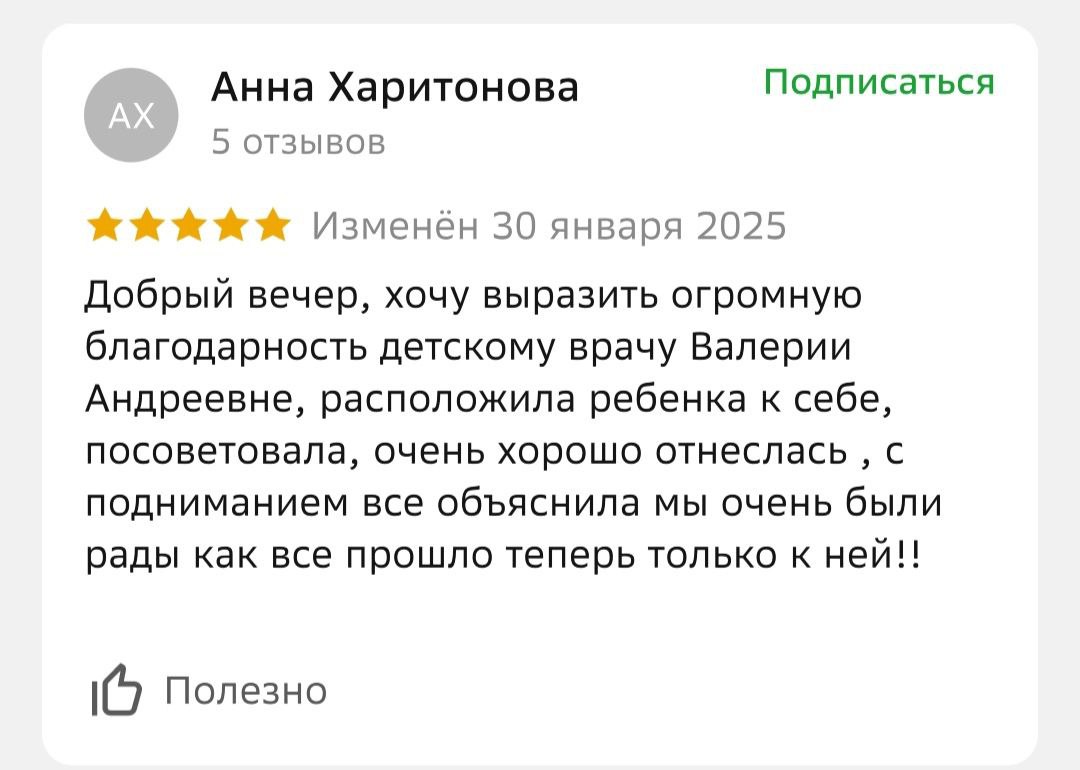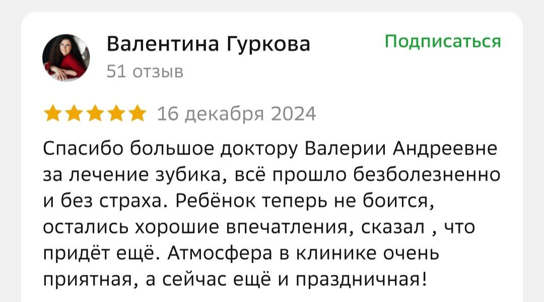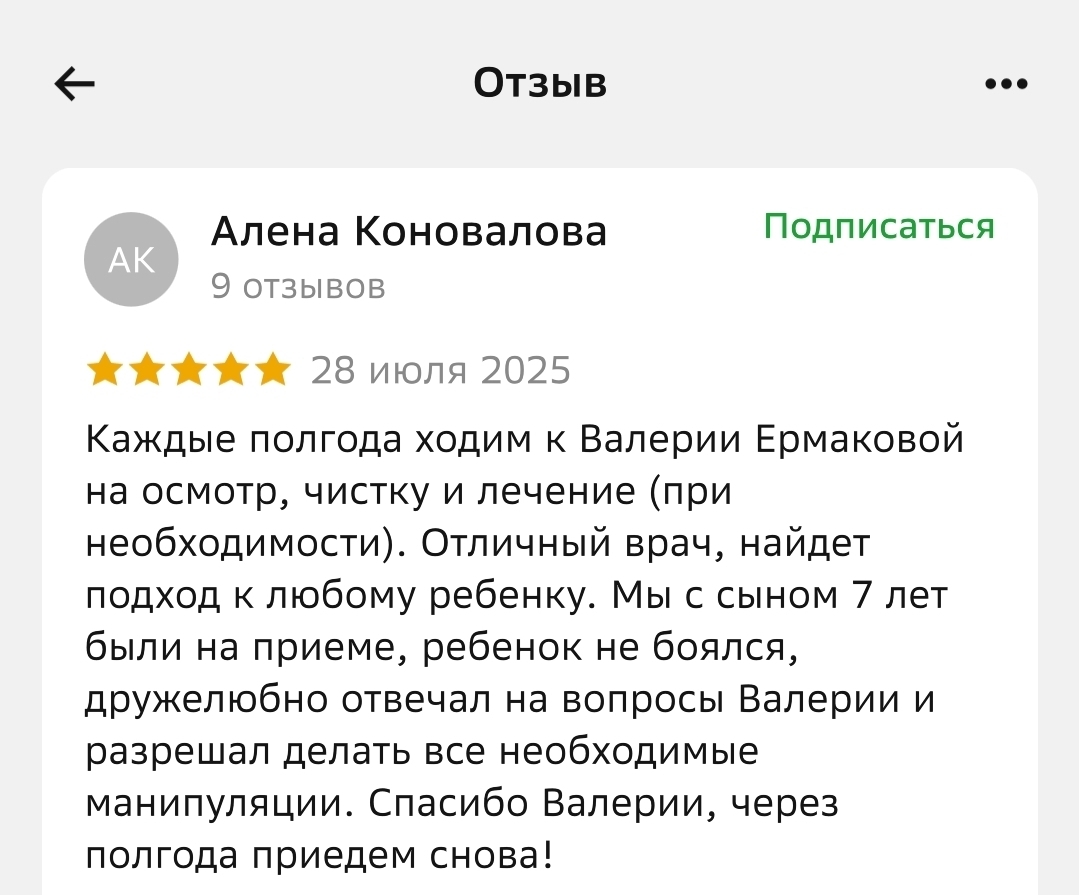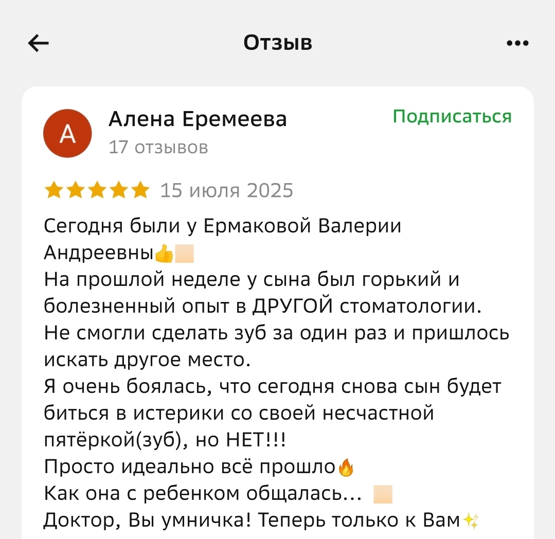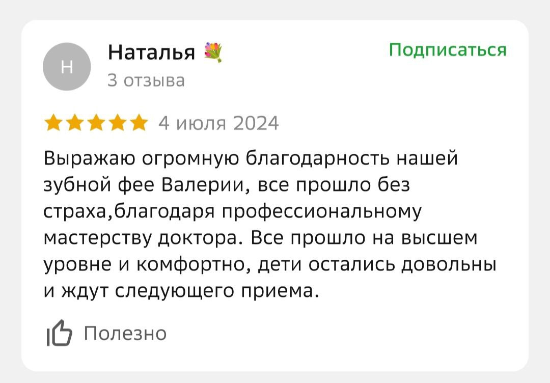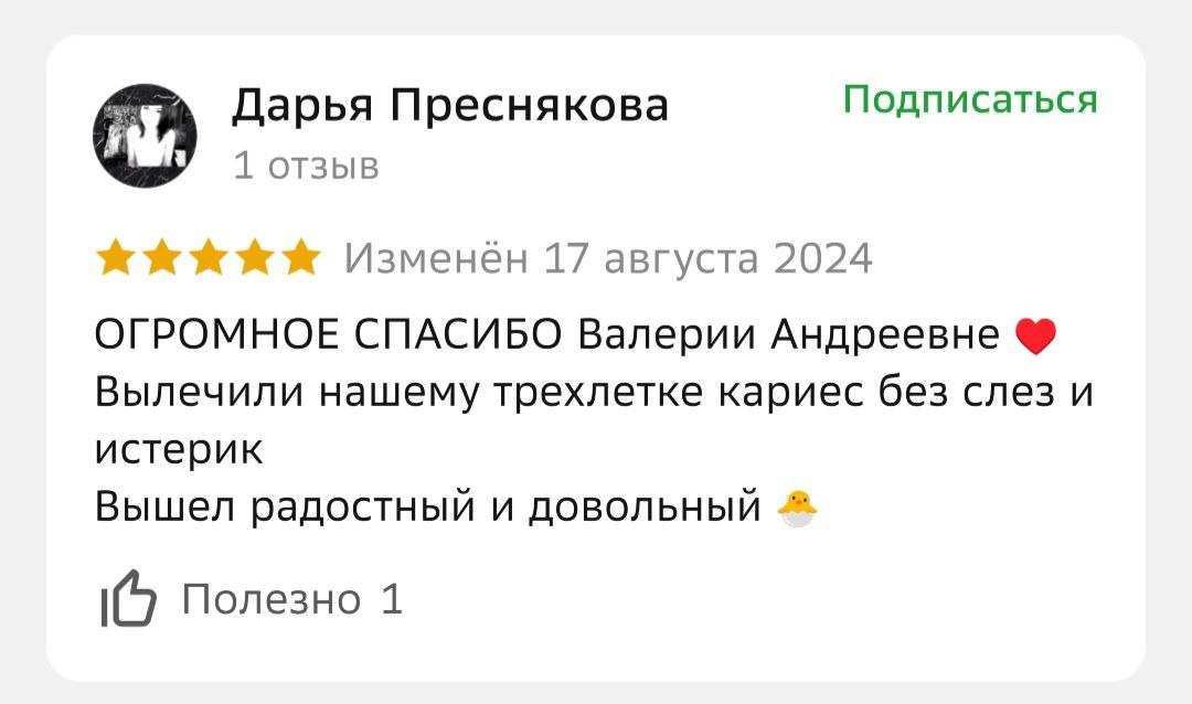 Что говорят наши пациенты о враче: «Профессионал своего дела! Нашла подход к моей дочке, которая в принципе боится всех врачей. За один прием вылечили аж два зуба сразу, я в восторге. Нравится, как она в процессе лечения всегда находится в контакте с ребенком».