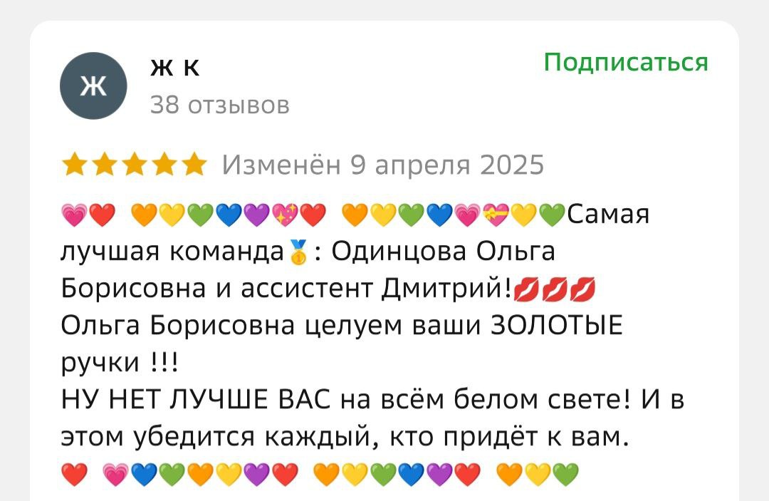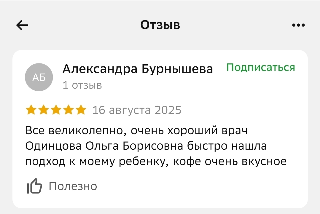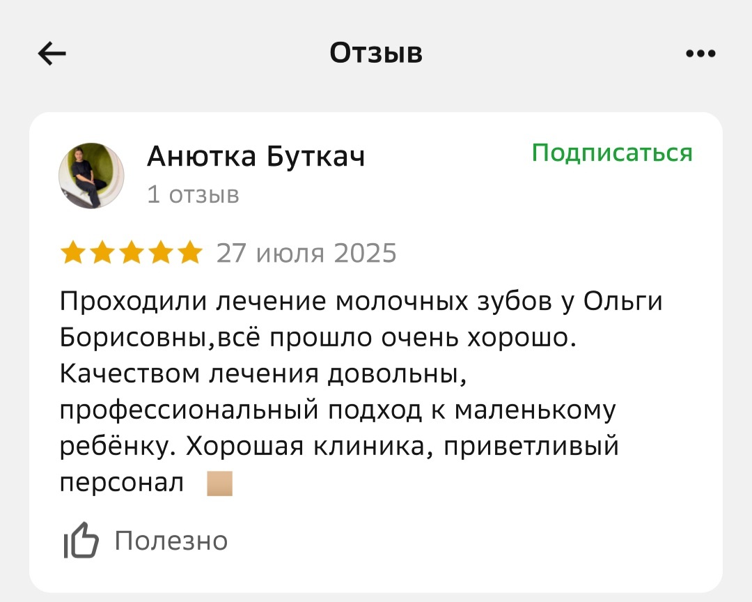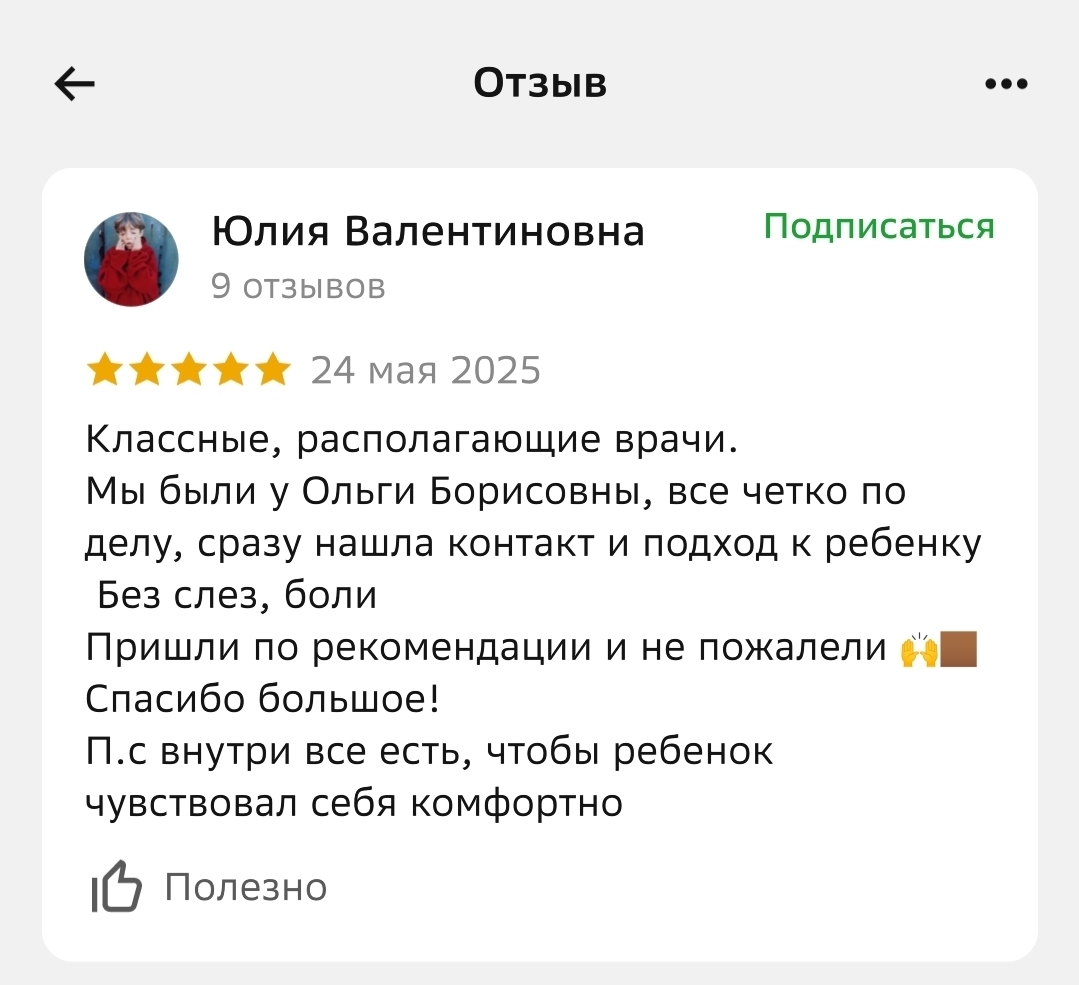 «Очень грамотный специалист, профессионал своего дела, которая сумела расположить к себе ребёнка на все 100% и теперь ребёнок согласен лечить зубки только у этого замечательного доктора».