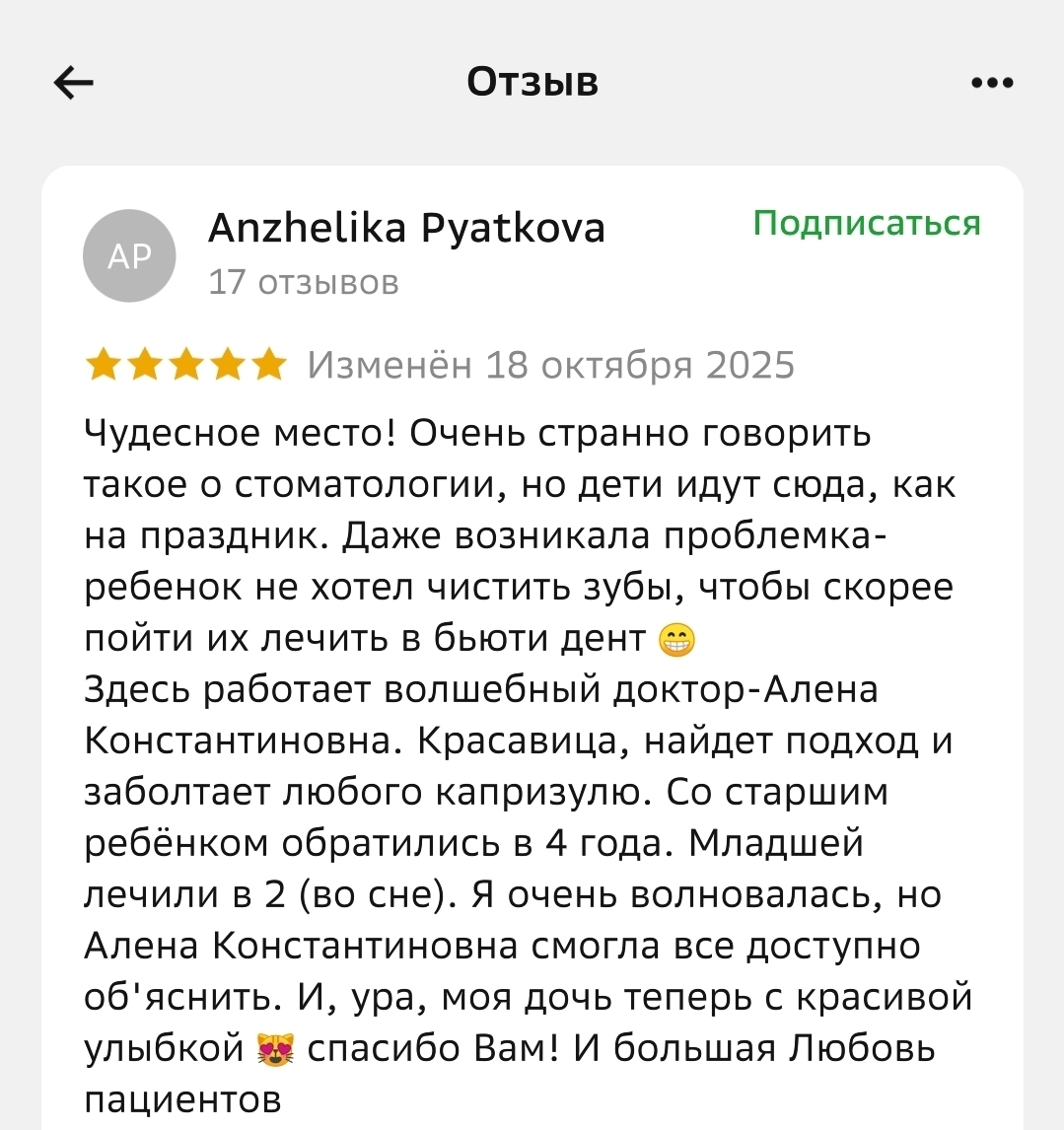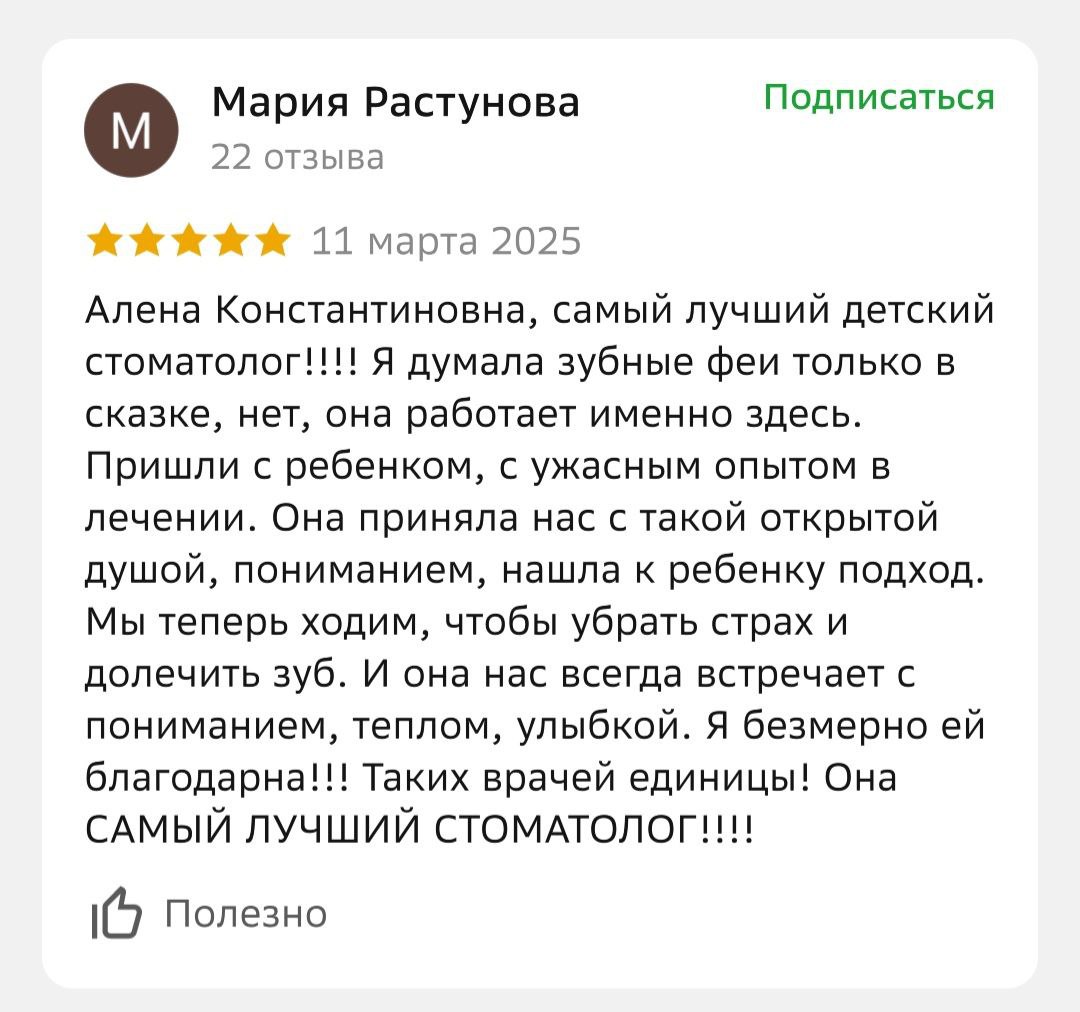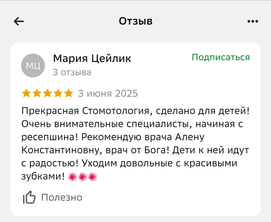 Что говорят о враче наши пациенты: «Настоящая зубная фея! Прекрасный доктор, которая сразу нашла подход к ребенку. Всегда выходим с хорошим настроением, нет страха и криков»