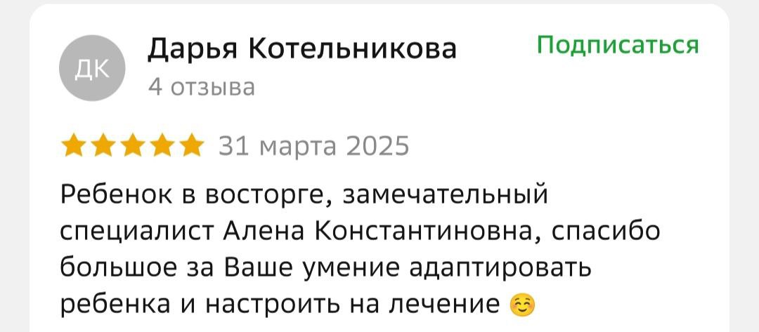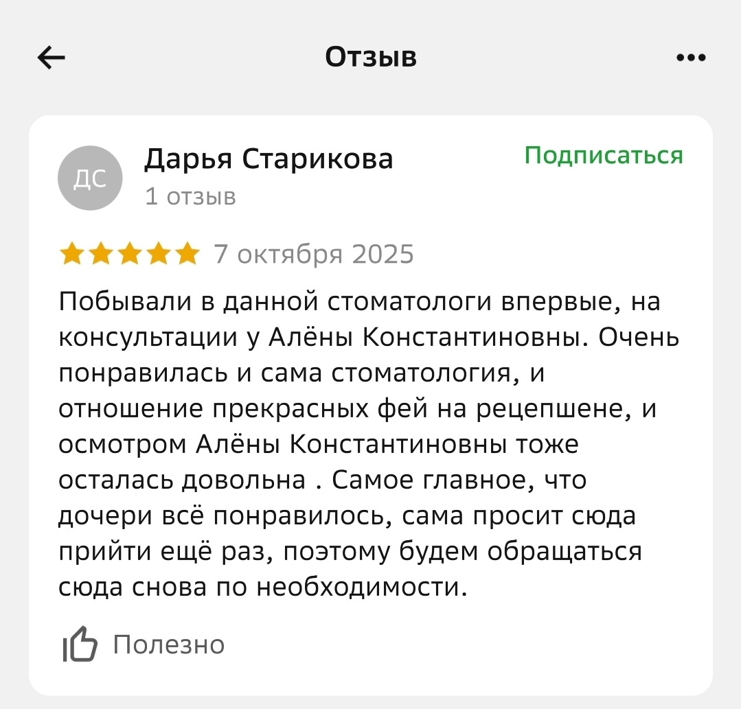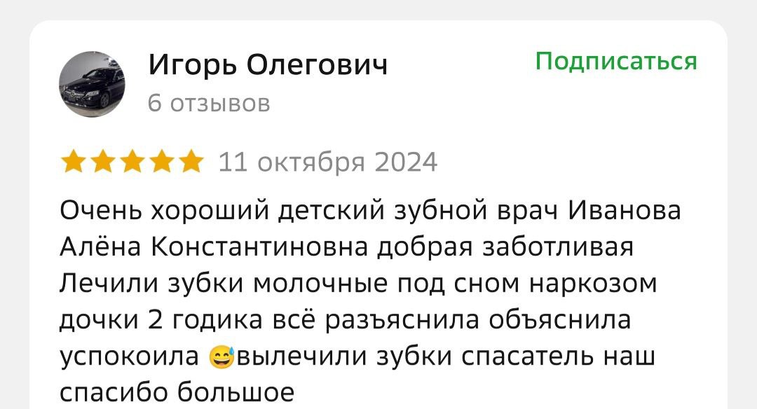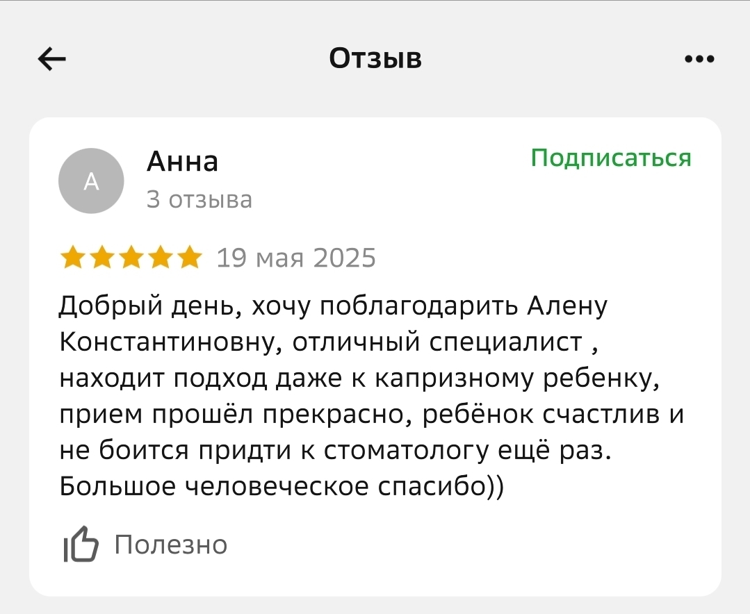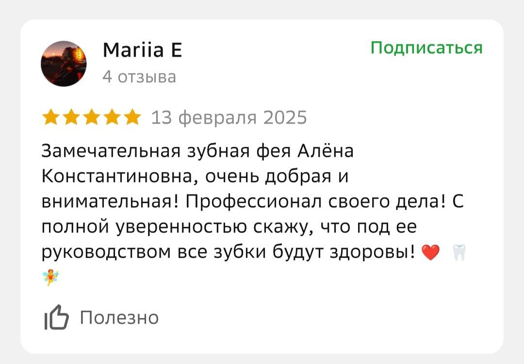 Что говорят о враче наши пациенты: «Настоящая зубная фея! Прекрасный доктор, которая сразу нашла подход к ребенку. Всегда выходим с хорошим настроением, нет страха и криков»