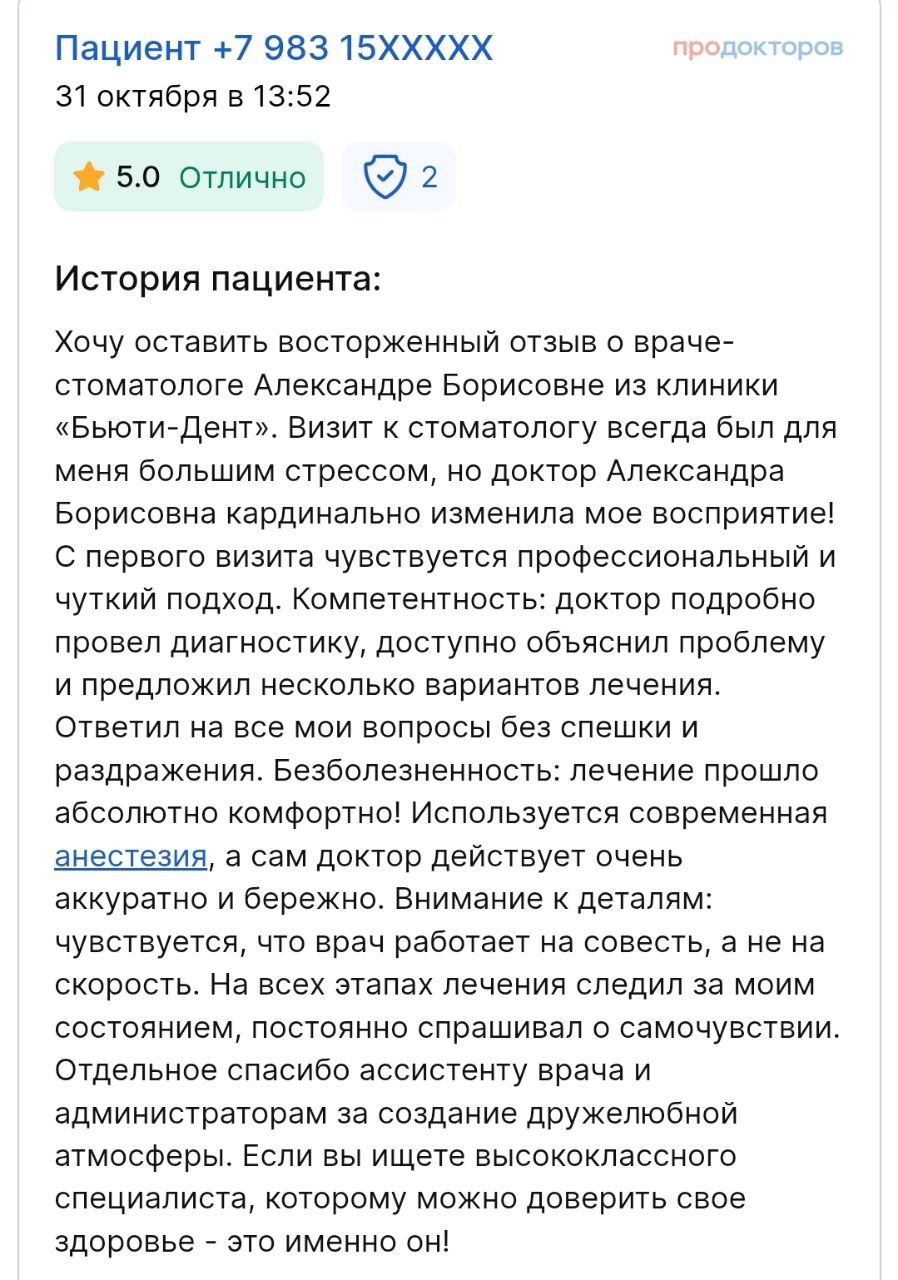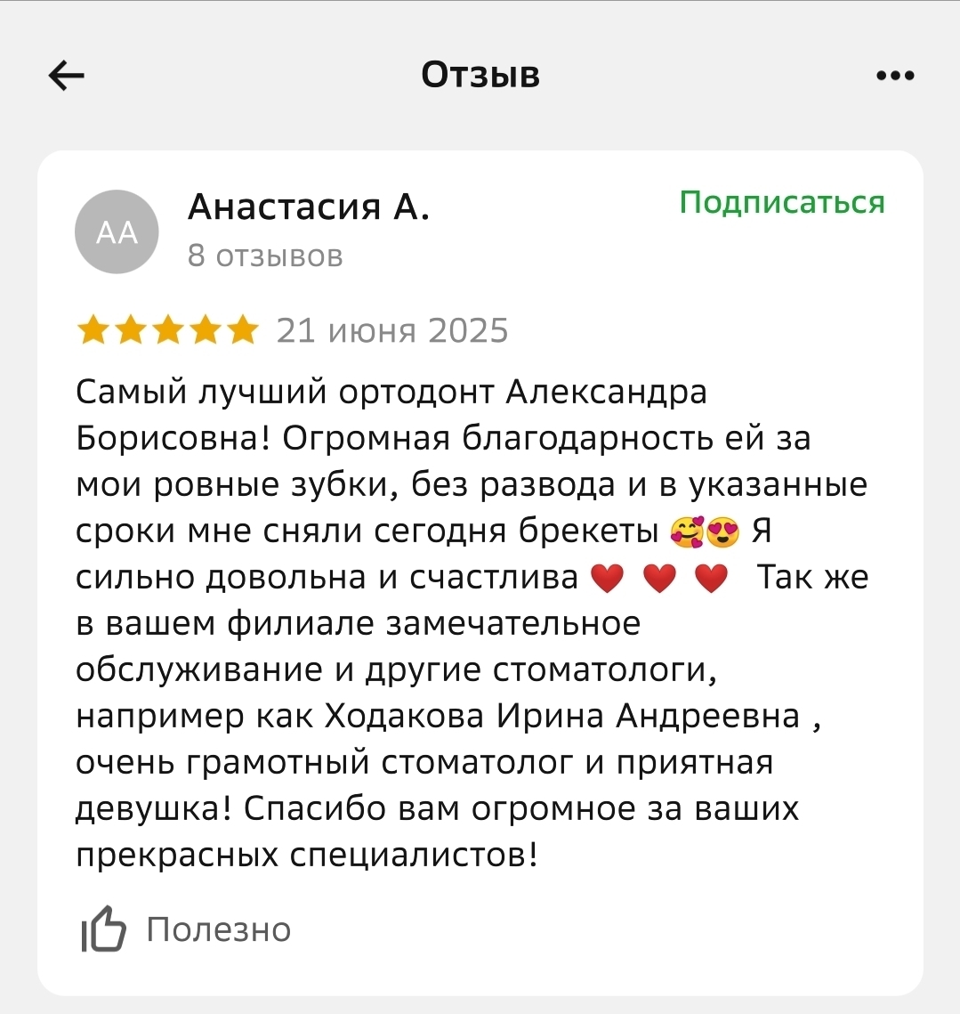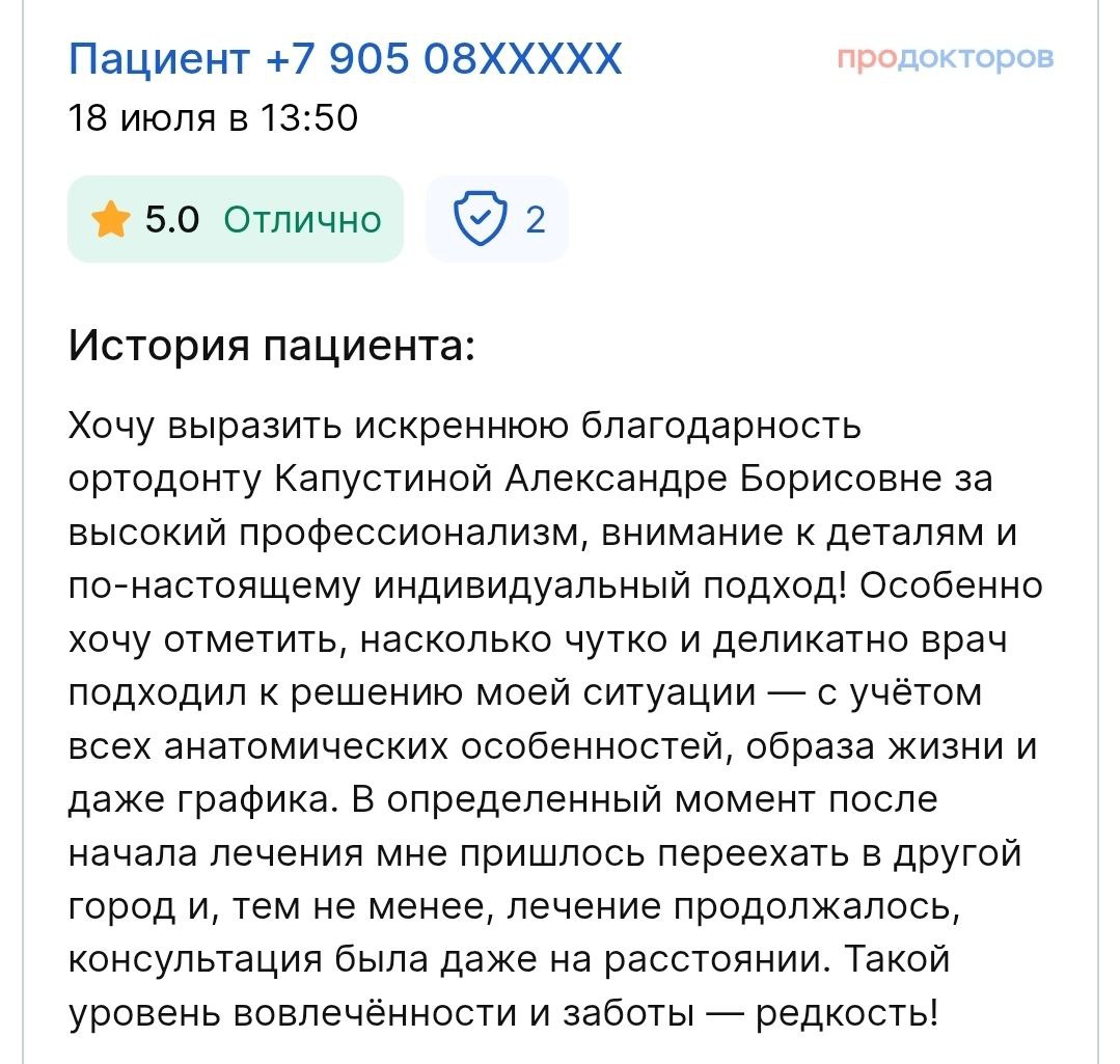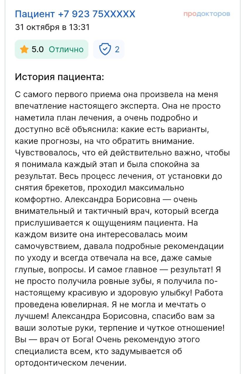 Что говорят наши пациенты о враче: «Ортодонт с большой буквы! Мы с мужем ставили брекеты у Александры Борисовны, результатом остались довольны на 100%. Внимательная, имеет высокий уровень профессионализма. Один из лучших специалистов в своей области. »