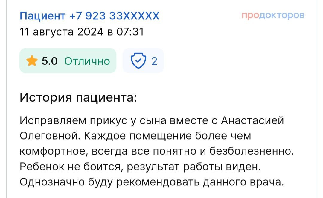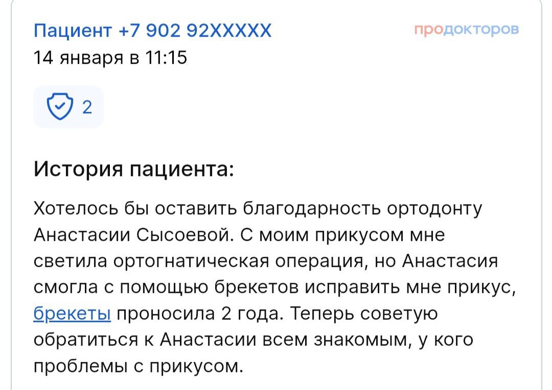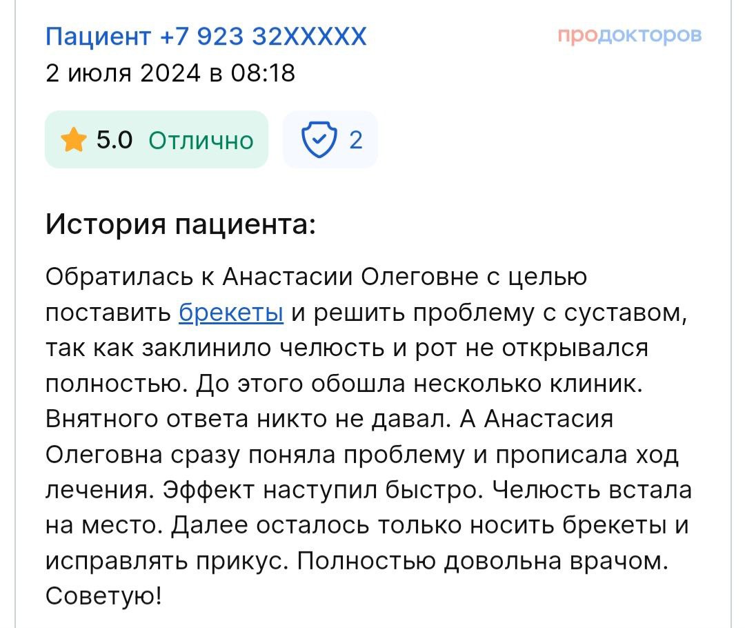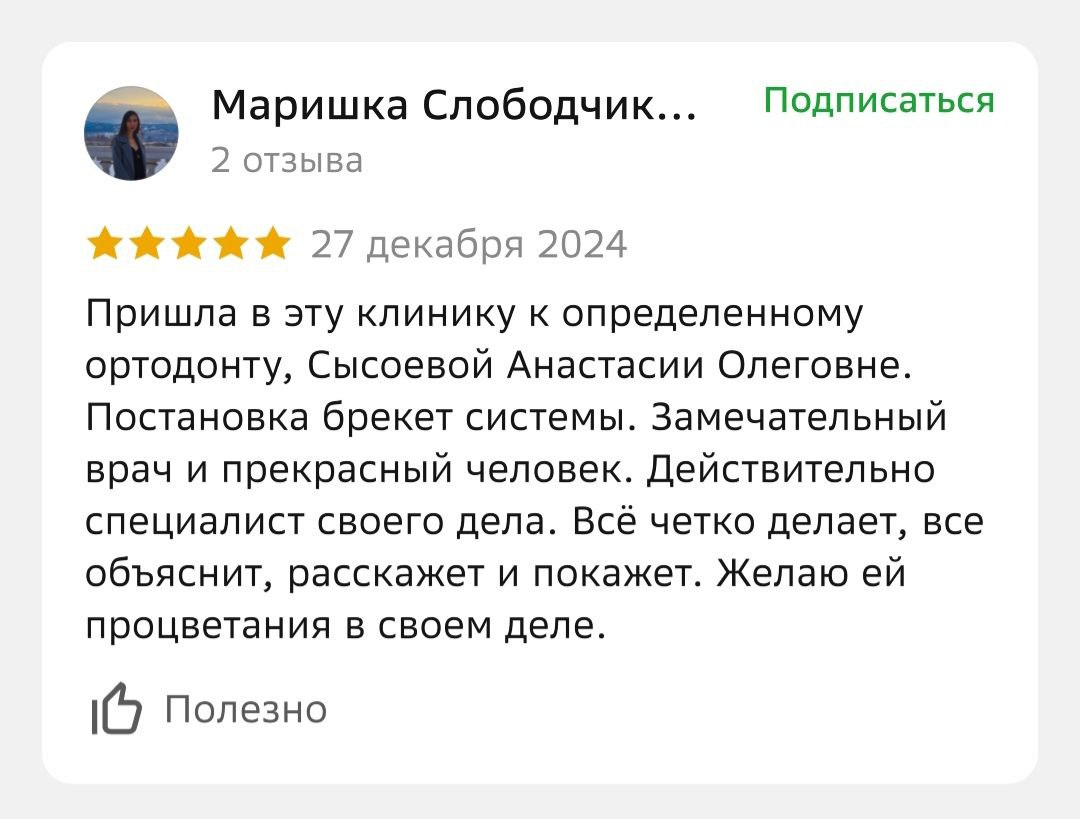 Что говорят о враче наши пациенты: «Очень чуткий, вежливый и внимательный доктор. Её профессионализм и внимание к деталям просто впечатляют, процесс ортодонтического лечения проходит максимально комфортно».