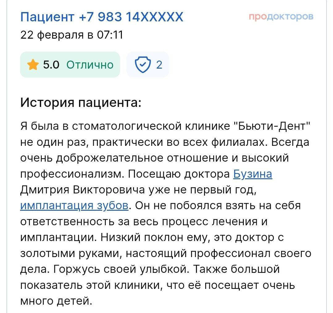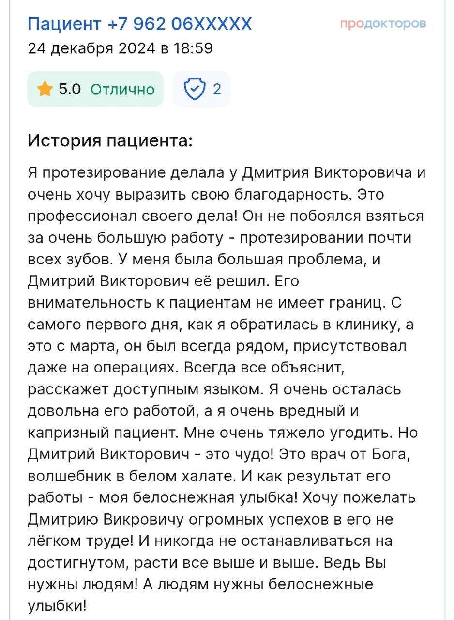 Что говорят наши пациенты о враче: «Всегда очень доброжелательное отношение и высокий профессионализм. Посещаю доктора уже не первый год. Низкий поклон ему, это доктор с золотыми руками, настоящий профессионал своего дела».