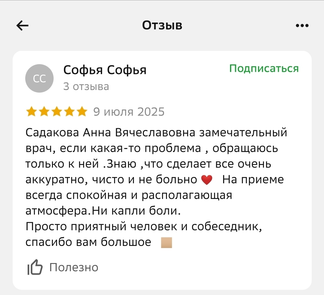 Что говорят наши пациенты о враче: «Обратилась к этому врачу по рекомендации близких и не пожалела. Доктор вылечили зуб быстро, спокойно, без боли и всякого дискомфорта! Я искренне благодарна за профессионализм, внимательность и чуткость».