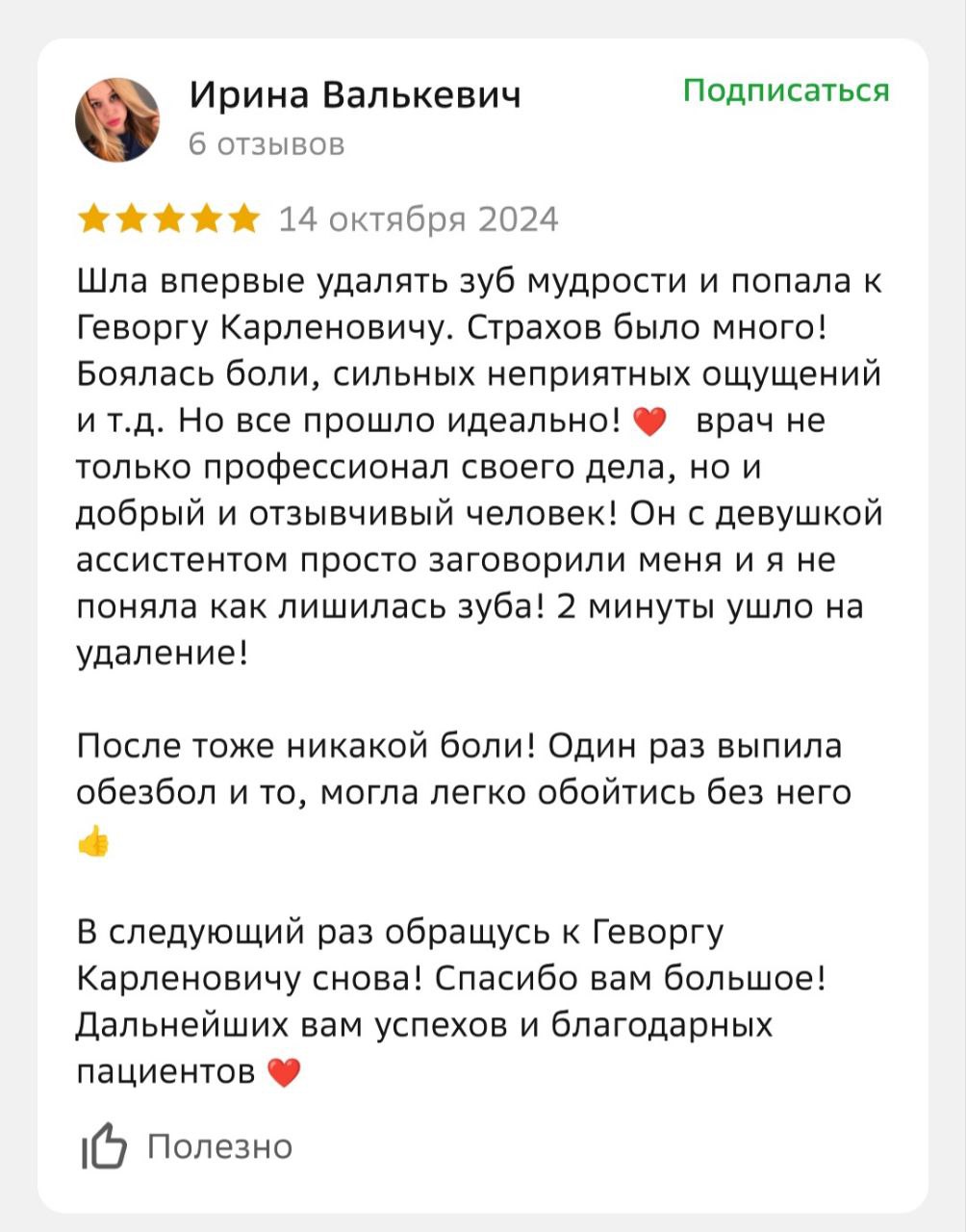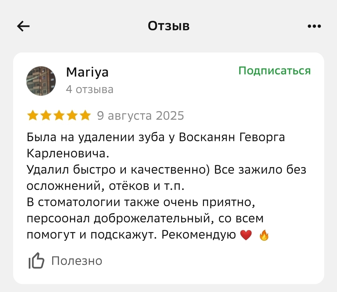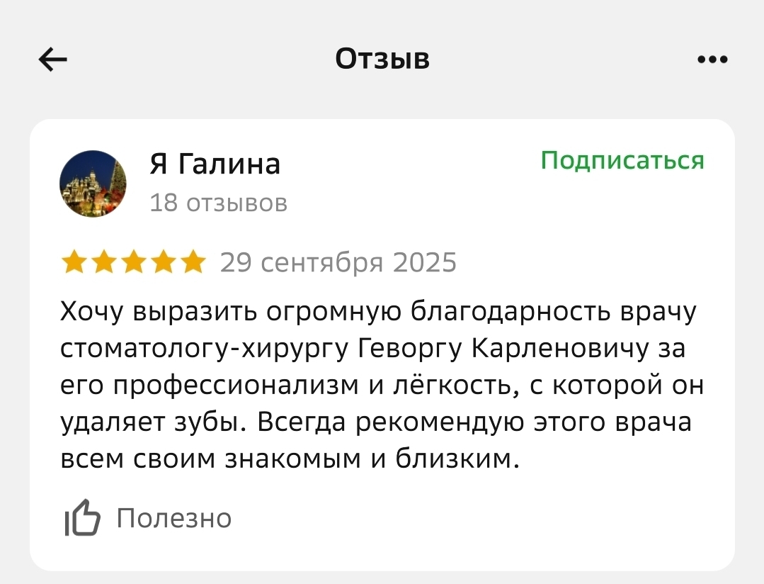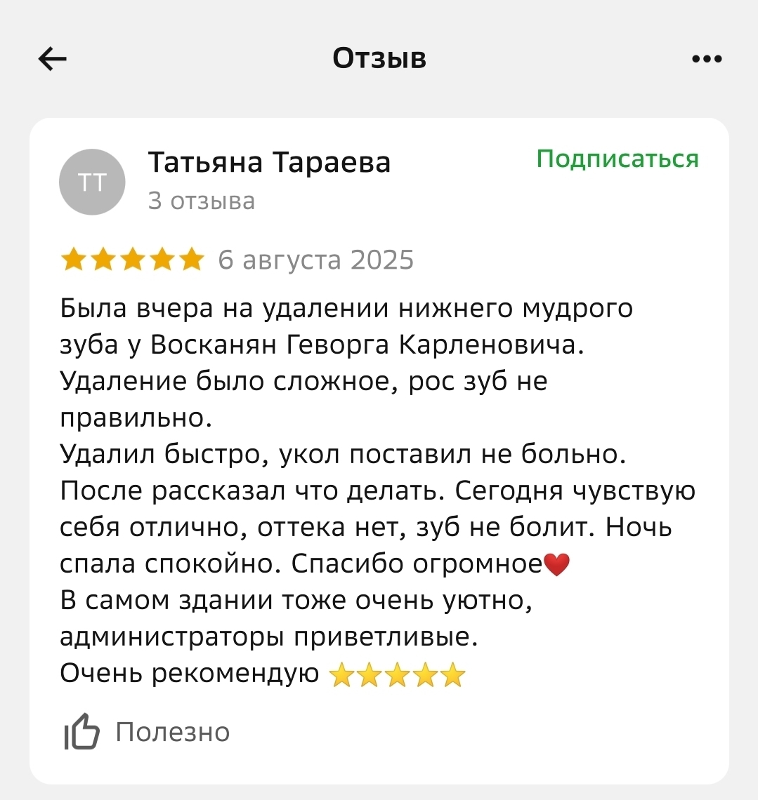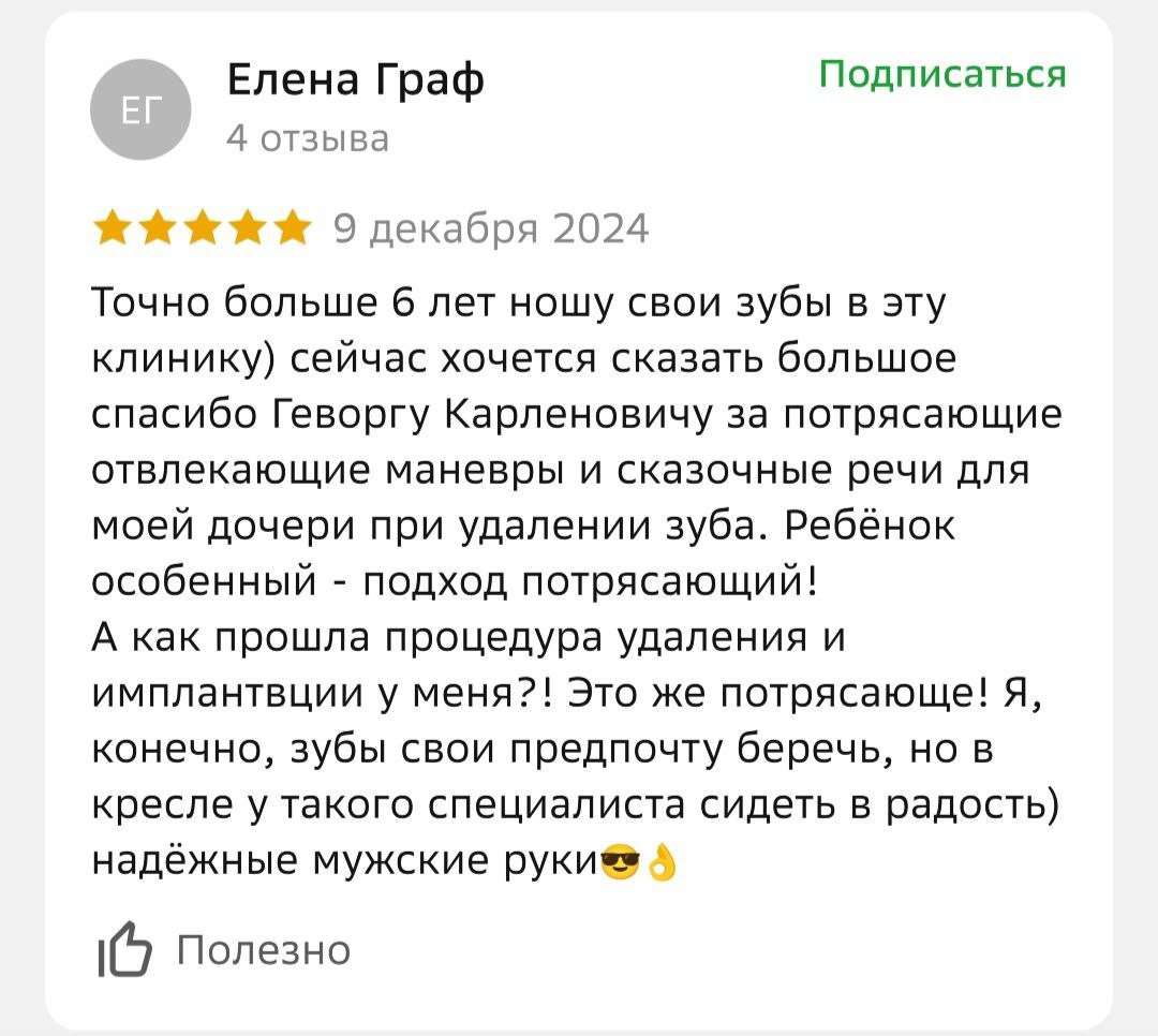 Что говорят наши пациенты о враче: «Специалиста выбрала по отзывам и не ошибалась. Доктор чуткий, внимательный, тактичный. Приём проходит в позитивной обстановке, доктор отвлекает разговорами и не замечаешь, как всё уже закончилось. Рекомендую на 100%».