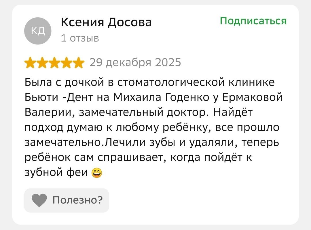 Что говорят наши пациенты о враче: «Профессионал своего дела! Нашла подход к моей дочке, которая в принципе боится всех врачей. За один прием вылечили аж два зуба сразу, я в восторге. Нравится, как она в процессе лечения всегда находится в контакте с ребенком».