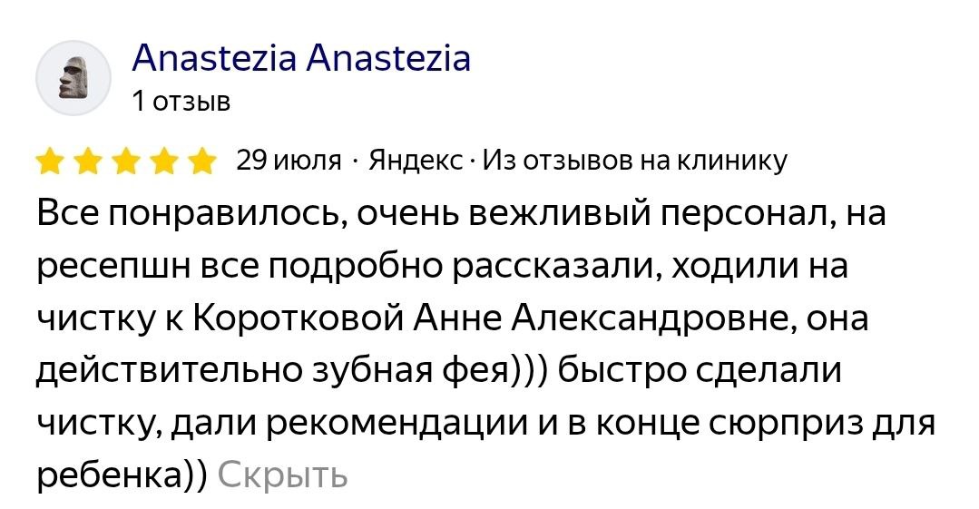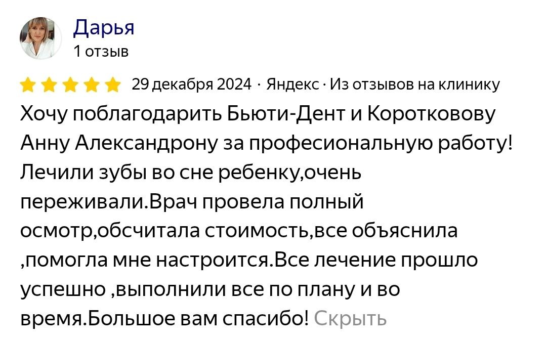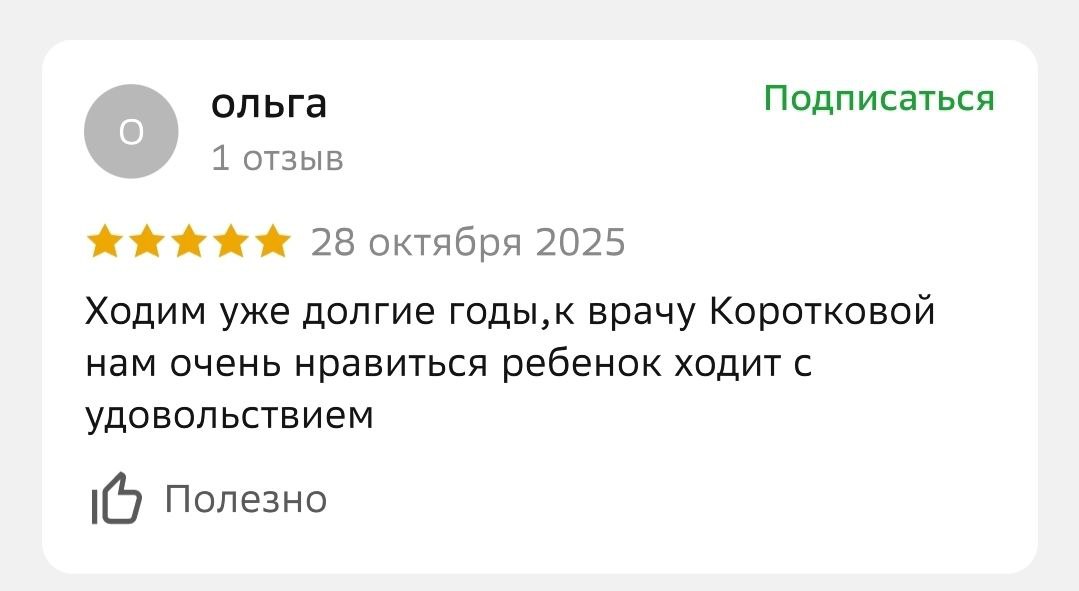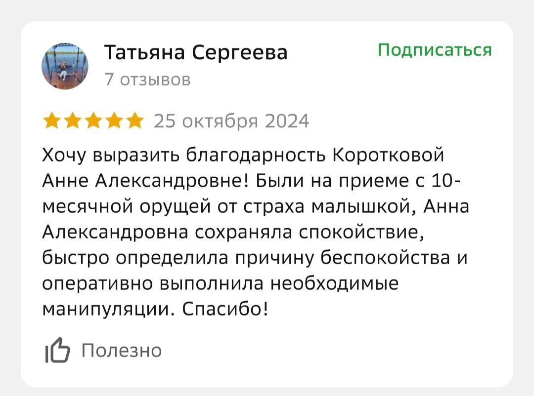 Что говорят наши пациенты о враче: «Дети ходят к Анне Александровне, всегда с удовольствием, даже сами просят записать их на профилактический осмотр. Доктор всегда найдет подход, даже если процедура не из приятных, то дети все равно выходят из кабинета с улыбкой на лице».