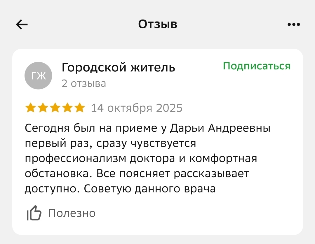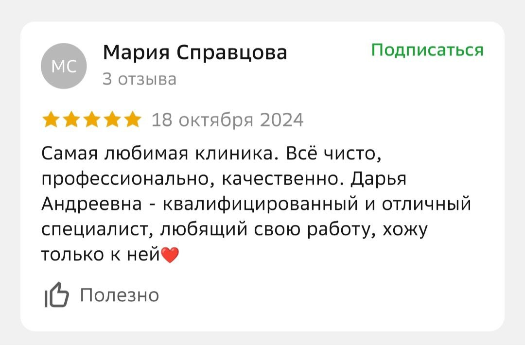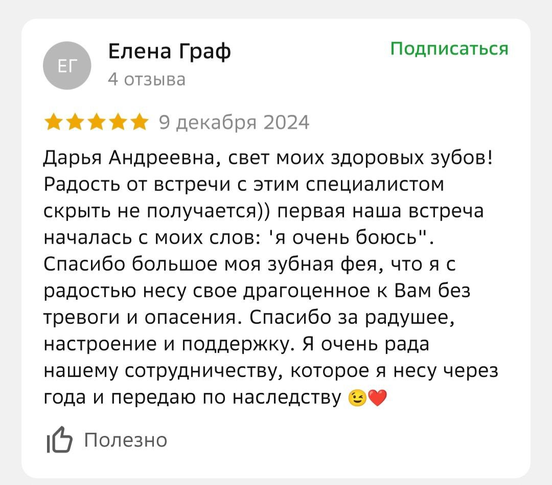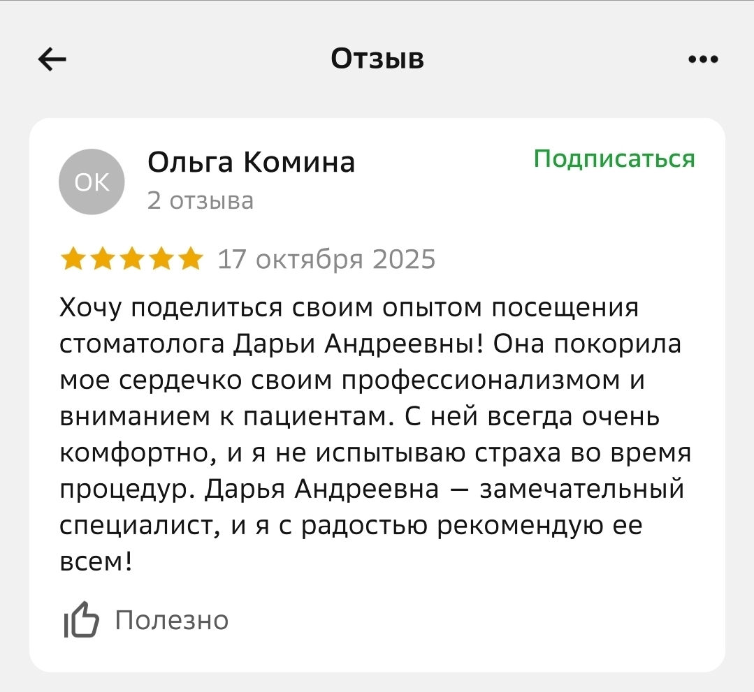 Что говорят наши пациенты о враче: «Невероятно позитивный врач, после каждого приёма выхожу с улыбкой. Хотя до этого я очень боялся стоматологов, но доктор развеяла мой страх, своей профессиональной работой, внимательным подходом, понимание и профессионализмом».